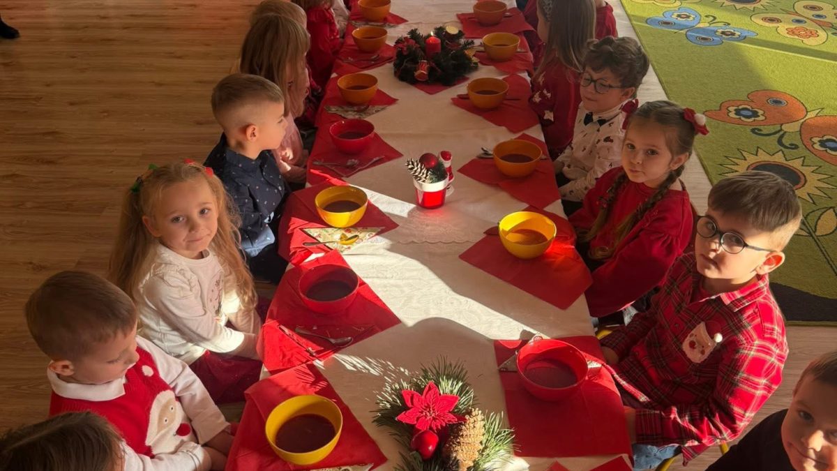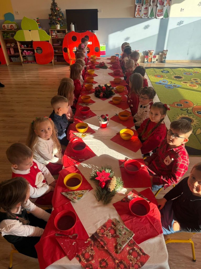Wszystkie dzieci, ubrane w swoje najpiękniejsze, odświętne stroje, zasiadły wspólnie do uroczystego obiadu wigilijnego przy przepięknie nakrytych stołach. 🍽️🕯️ Było wspólne śpiewanie kolęd, składanie sobie najcieplejszych życzeń i mnóstwo radosnych uśmiechów! 🎶🎤😊💬❤️